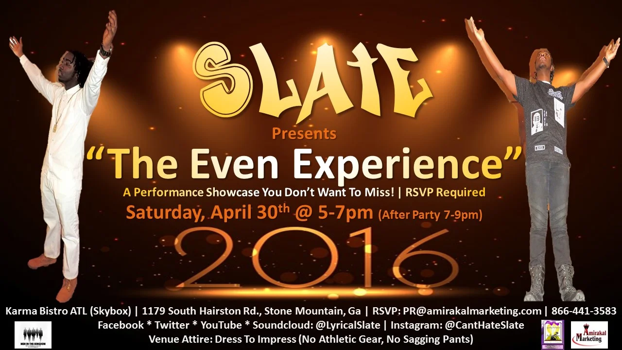 Slate: I just want to thank you for this opportunity, and I’m stressing the Even Experience! April 30th at the Karma Bistro, in the SkyBox. 1179 South Hairston Road, in Stone Mountain. Doors open at 4:30, and it goes from 5pm - 7pm. Single is coming April 30th, and EP is coming soon!